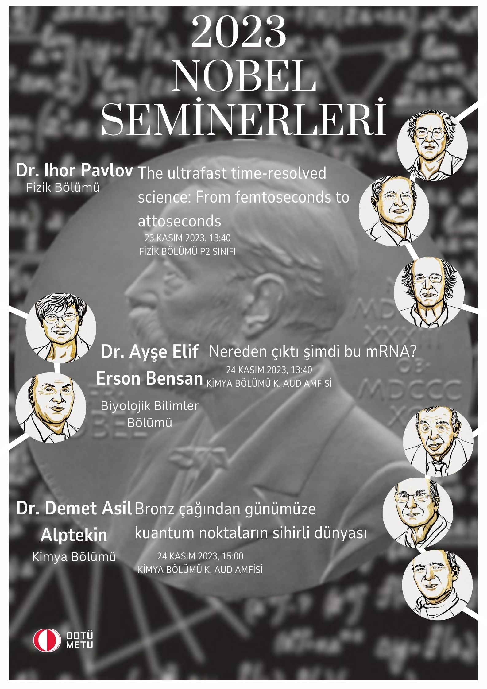 Fakültemiz öğretim üylerinin 2023 Fizik, Fizyoloji veya Tıp ve Kimya Nobellerinin önemini açıklayacakları seminerleri 23 Kasım 2023, Perşembe günü başlıyor.